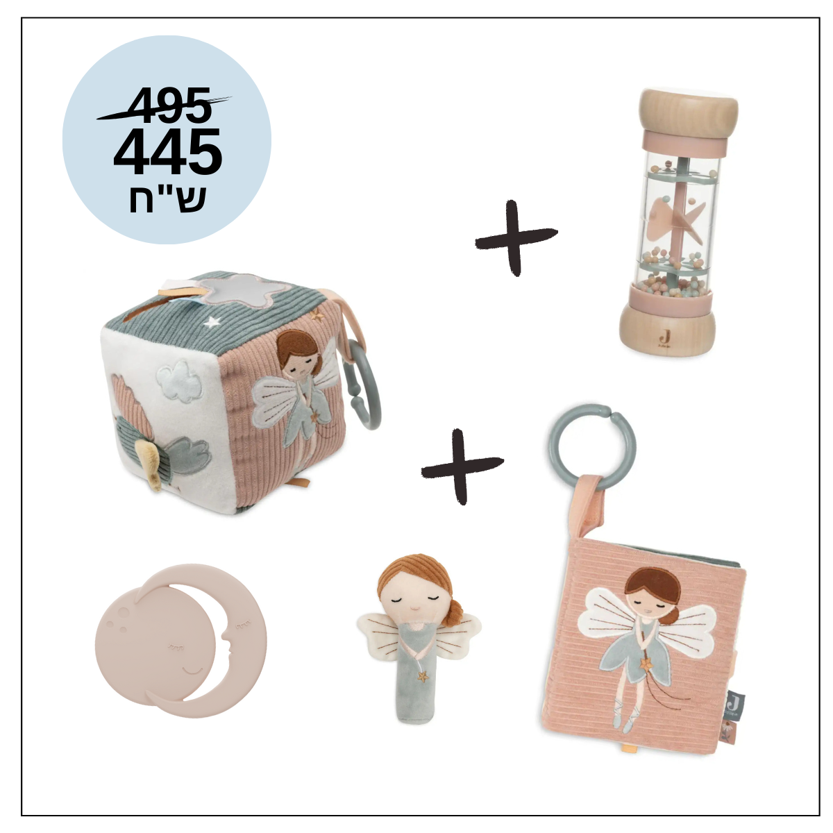 מארז לידה מתוק במיוחדבעיצוב פיות וציפוריםבצבעי פסטל נעימים ועדיניםמה במארז?קוביית פעילות מתוקה ומרשרשת עם בדים ומרקמים שוניםספר פעילות תואם עם טבעת שניתן לחבר על התיק/ עגלהרעשן מקל גשם עם צליל קסום ומרגיערעשן פיה רך ונעיםנשכן ורוד בצורת ירח!מתנת לידה מושלמת שכל אמא תשמח לקבל