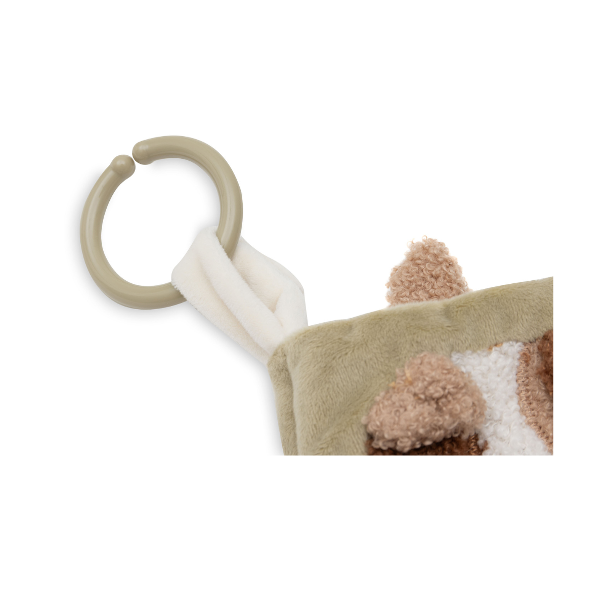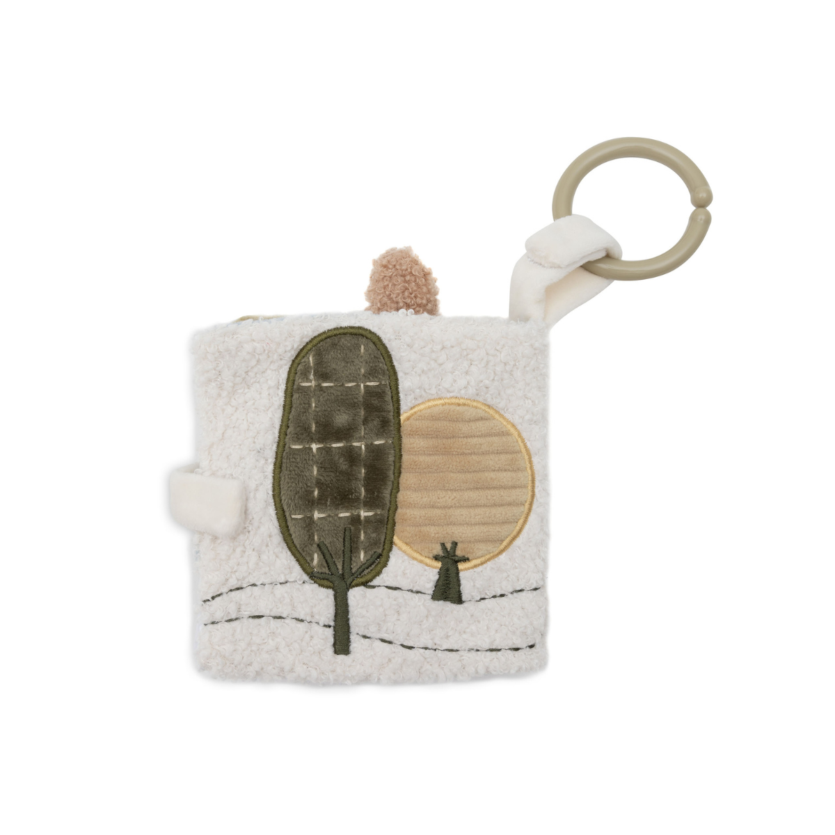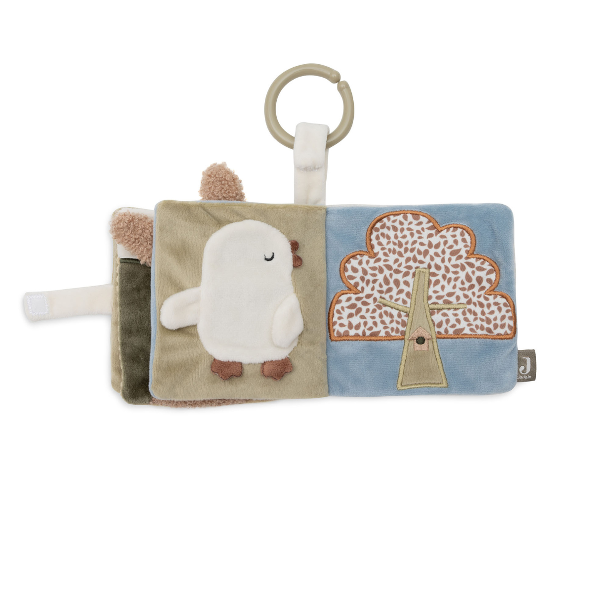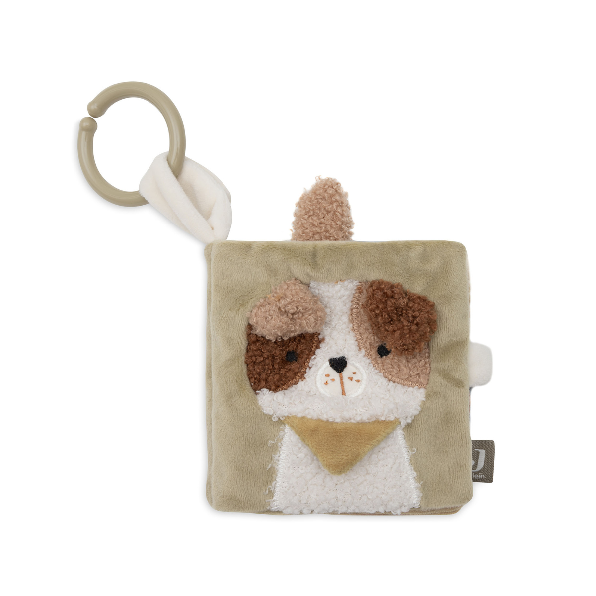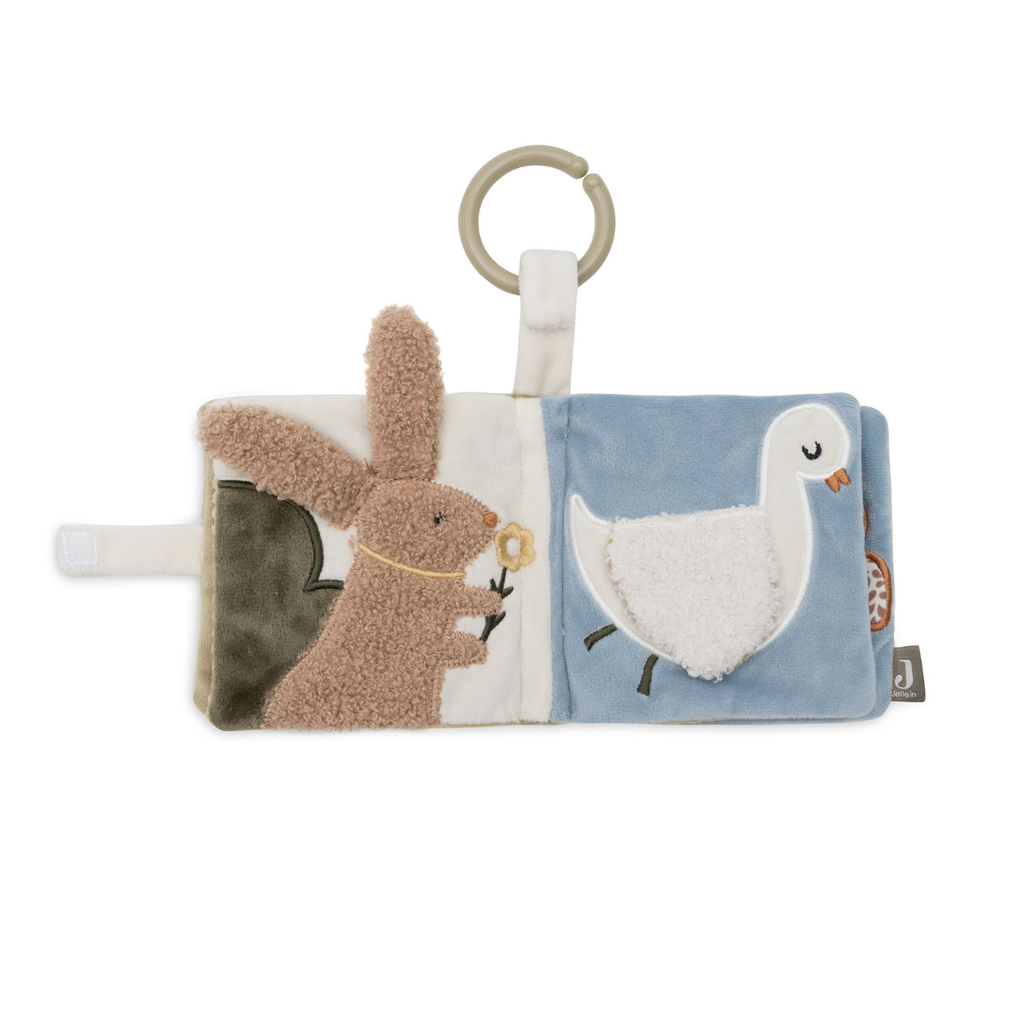 ספר רך ומתוק במיוחד עם איורים של כלב, חתול, ברווז וארנב בגווני ניוד, תכלת וירוק, ואלמנטים חושיים  רכים